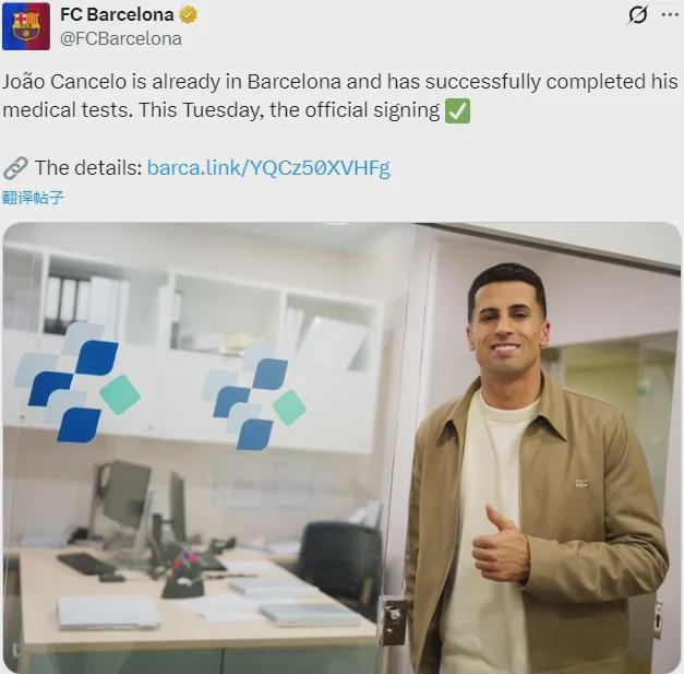 官方:巴萨宣布坎塞洛已经完成了体检和体测,这名边后卫将从利雅得新月以租借的形式加盟直到夏天。